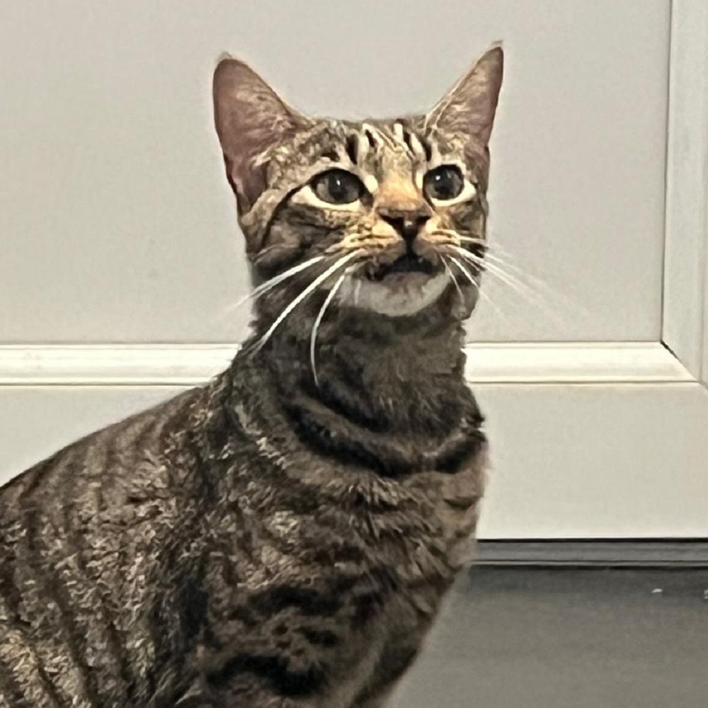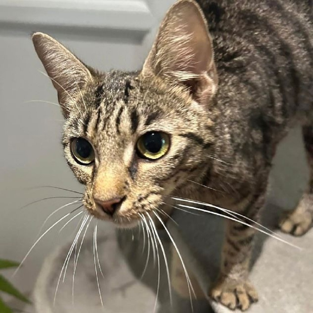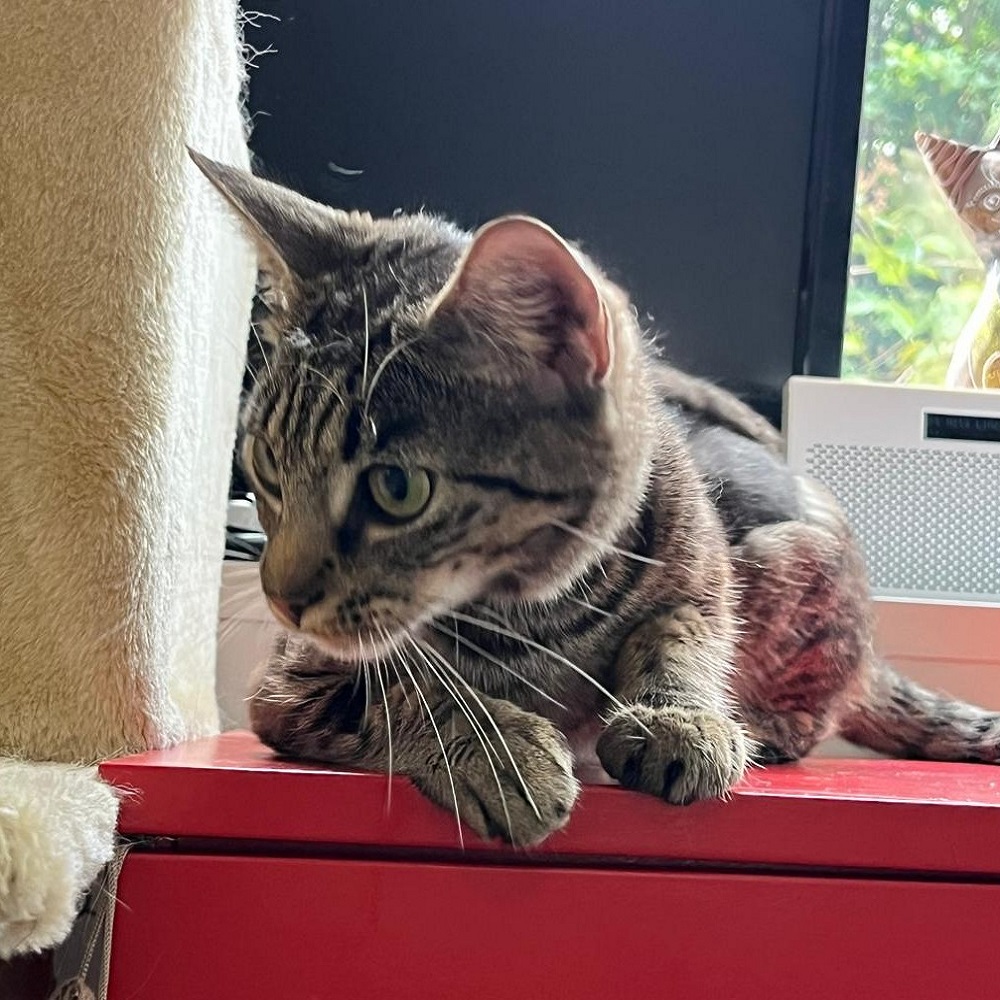 She is a delightful tabby, very friendly and calm, and could be rehomed either on her own or with other cats, as long as a slow introduction is arranged. We have been trying to get some more photos of her to show you how adorable she is, as the current ones we have do not reflect her amazing personality, she is so keen to be with you and doesn’t sit down for long before she wants to be around you trying to catch your attention!